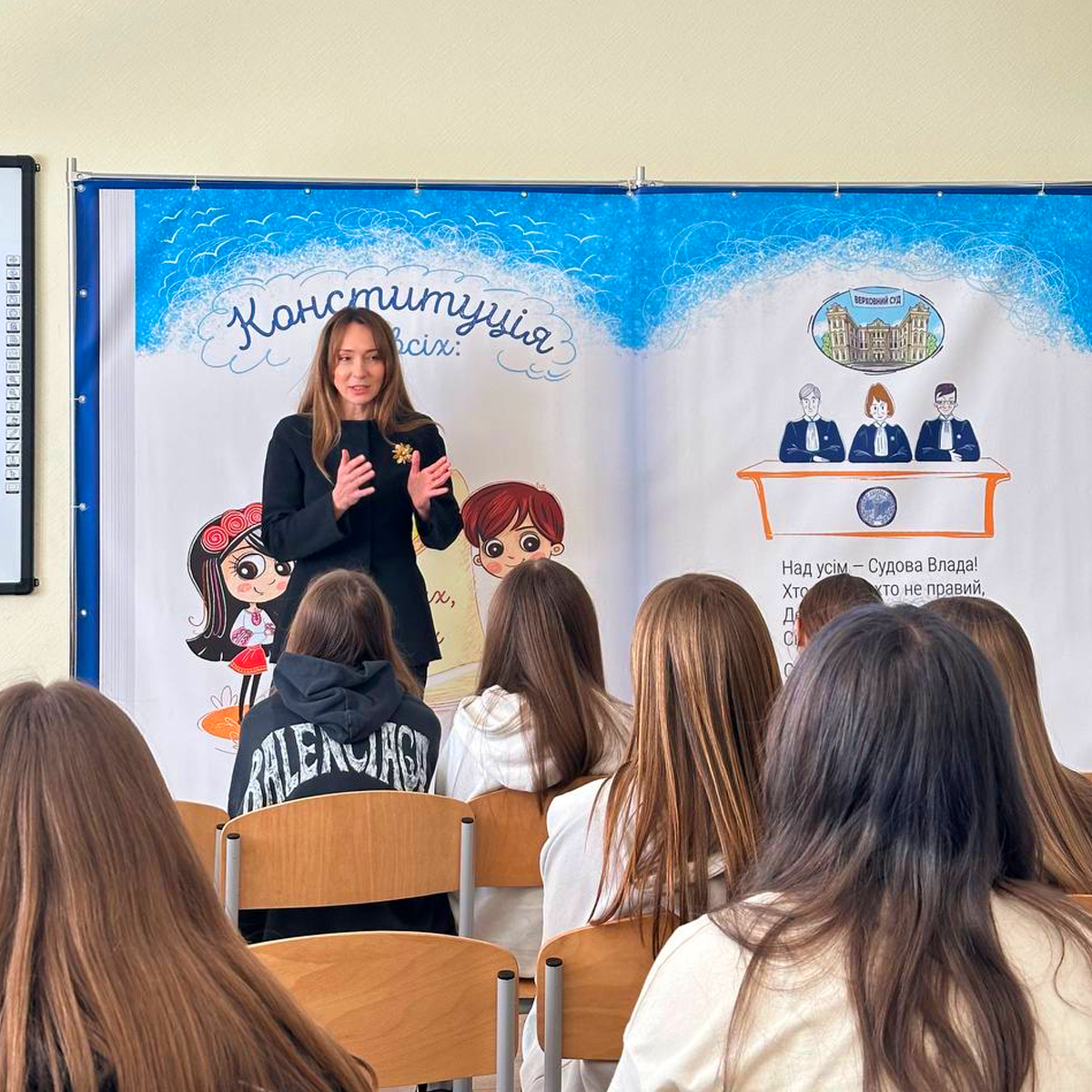 Наталія Коваленко — мама Катерини (8-А, TIS) — організувала урок справедливості для 6А та 8АВ. Була фотозона, банер, солодкі подарунки, а головне — щире спілкування про важливі життєві цінності.