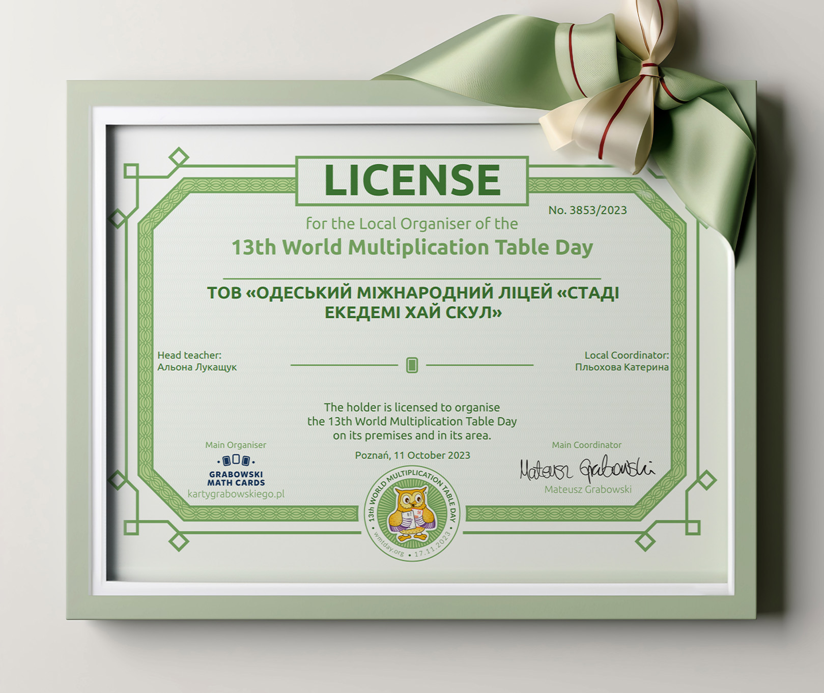 Ділимося радісною новиною! Наш ліцей отримав ліцензію від Zespół organizatorów ŚDTM Karty Grabowskiego на проведення 13-го Всесвітнього дня таблиці множення (ŚDTM 2023). Що це означає? Те, що цьогоріч наші учні й викладачі змогли долучитися всесвітнього свята математики, яке започаткували ще в 2010 році. Мета заходу — зробити вивчення таблиці множення легким і веселим заняттям, поглибити інтерес до точних наук і розвинути в дітях ще більшу цікавість до предмета.